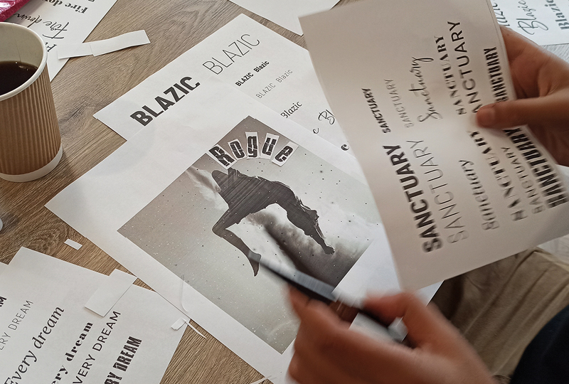We looked at fonts and how the style of a font can be used to create a meaning and atmosphere in design work. We also looked at principles of layout, including hierarchy and spacing. The young people were then given a random square image and had to create arecord cover sleeve. They were provided with a choice of artist names and song titles printed out in various fonts and sizes, which they needed to combine with their image to create the final sleeve design.